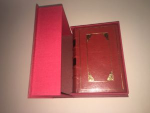 Boxes protect books. Below are two clamshell boxes – the first one has a flat spine and the second has a rounded spine. The rounded spine looks just like a book on the shelf. One drawback of boxes is that they take up a lot of space.